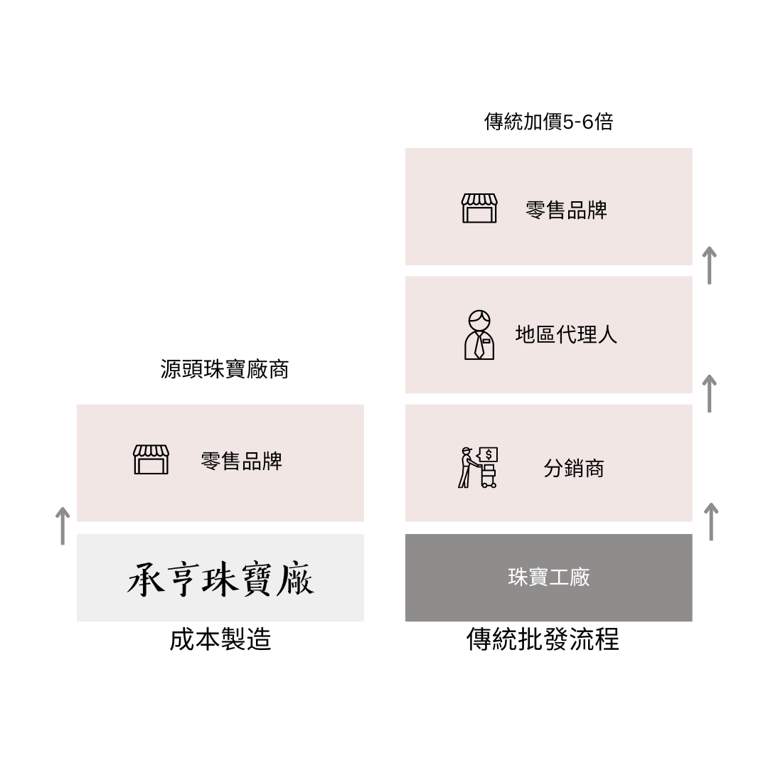 傳統的批發業通常以五至六倍的實際成本價格銷售產品。然而,在承亨珠寶,我們的獨特之處在於我們是源頭的珠寶製造工廠。所有的產品均由我們自家工廠生產,因此在品質控制,生產速度,以及顧客接洽等方面,我們具有顯著的優勢。這也是我們與其他批發商的主要區別之處。